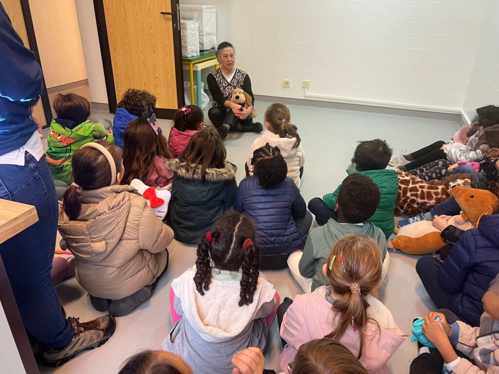 Os alunos e o seu brinquedo (sentados no chão, no gabinete número 26 ) ouvem muito atentos a história da Cadelinhana que se deslocou a uma unidade prestadora de cuidados de saúde.
